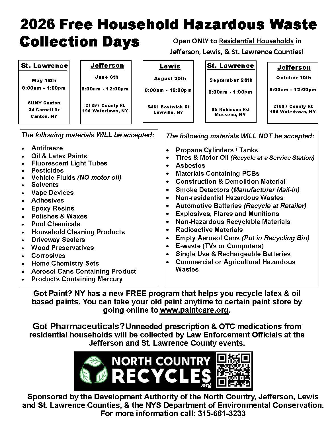 Household hazardous wastes are products that can be found in your home that can catch fire, react or explode under certain circumstances, be corrosive or toxic, and may be dangerous to human health. It is vital that you limit the usage of these products, as well as dispose of them correctly (not in the landfill) as an environmentally sustainable practice. To ensure the North Country disposes of its waste properly, the Development Authority of the North Country and the three counties collaborate on Household Hazardous Waste Collection Days. They are free open to all residential households. Businesses, schools, farms, municipalities, or conditionally exempt small quantity generators (CESQGs) are excluded.